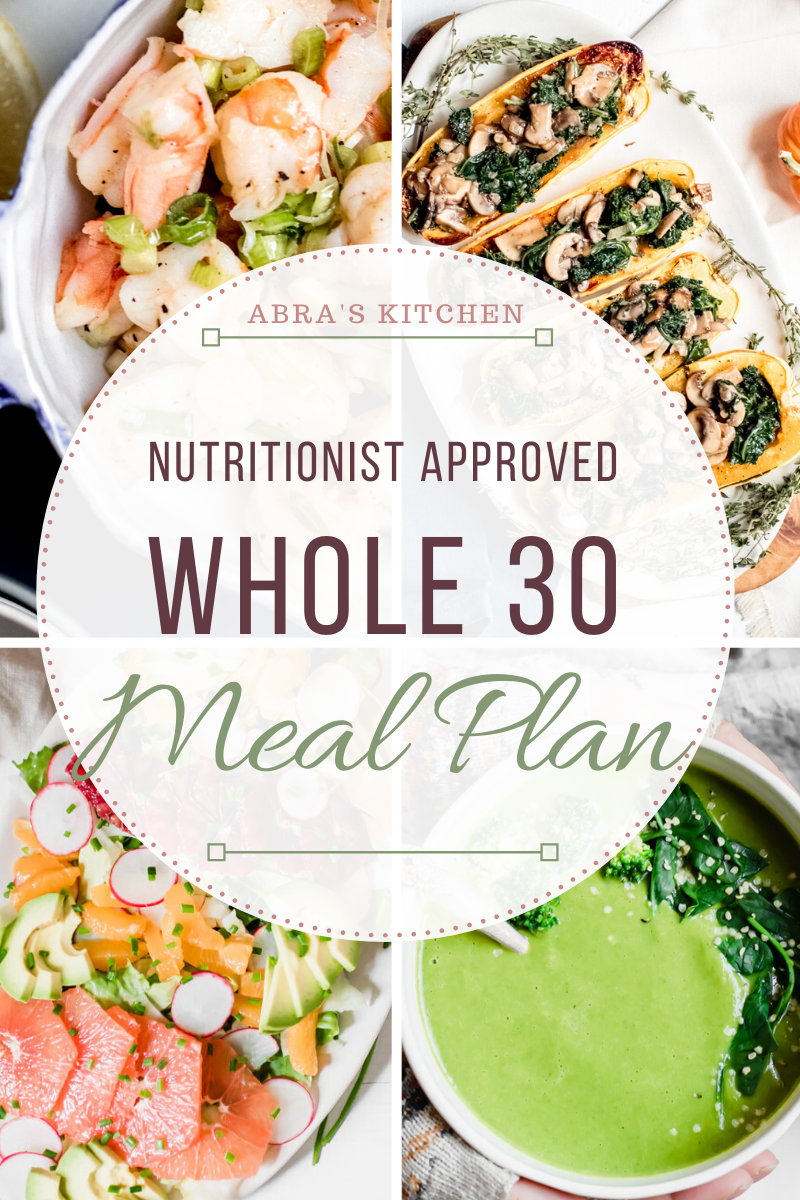 A wholesome, delicious, 7-day Whole30 meal plan! Perfect for your next Whole30 adventure! Healthy supportive recipes for breakfast, lunch, dinner, and snacks. Curated by a nutritionist. Complete with grocery list, meal schedule, full nutritional analysis, and printable recipes!